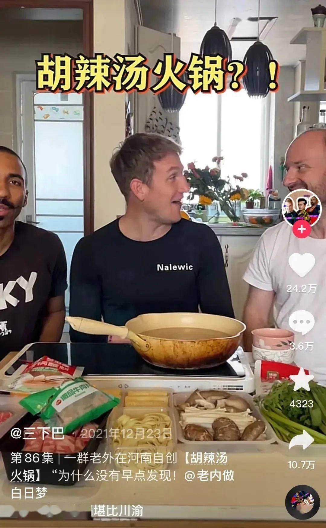 外国抖音博主“三下巴”自创“胡辣汤火锅”,当他用河南口音喊出“乖乖咧!”,河南本地人也不得不被这个吃法惊艳。同时,河南人的一波“胡辣汤火锅”美食文化输出,直接将其送上抖音热门话题榜,获2885.9万次播放量。