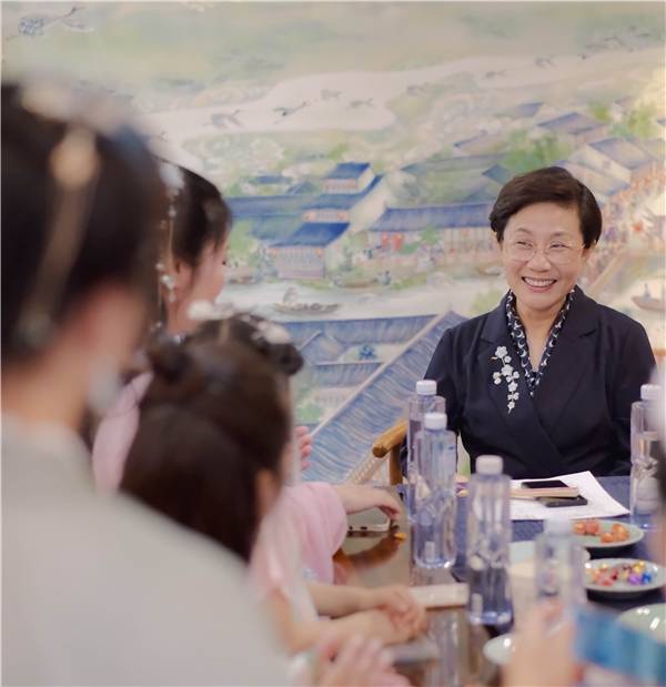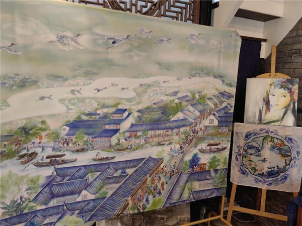 在水云间及雅集活动中,《新场寻仙记》系列刺绣和绘画作品也令中外参观者惊奇不易,感慨清净老师绘画的精湛工艺。展厅内,一幅幅作品风格迥异,每幅作品都有故事、有灵性。书画家们爱国深沉,以笔墨讴歌时代,以丹青书写情怀,使参观者深受感染。谈起创作灵感,她说道:“绘画系列《新场寻仙记》的创作灵感,来源于一个穿越千年的梦。我在梦里穿越到了千年前的新场古镇,天空中有美丽的仙鹤在祥云中飞翔,那时候的包家桥叫受恩桥,我在古街古巷古人中行走,似乎看到仙女穿梭于小桥之上。于是我就把梦中之景画下来,创作了这些作品。”作为一名旅居加拿大的华侨,她一直把“推广刺绣画作,讲好中国故事”视为自己的初心使命,希望通过中国传统绘画作为连接中外民间友谊的桥梁。