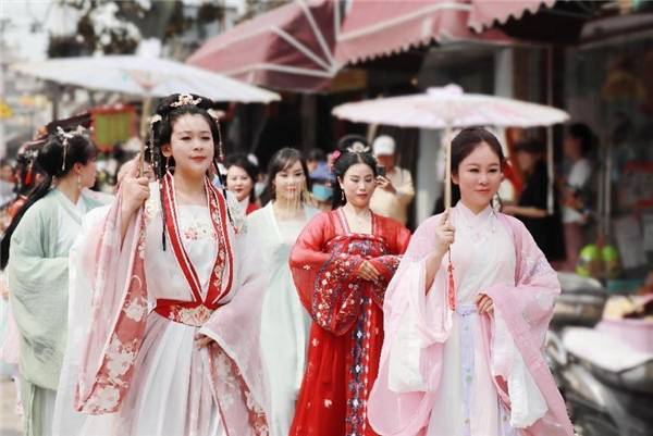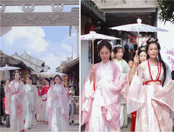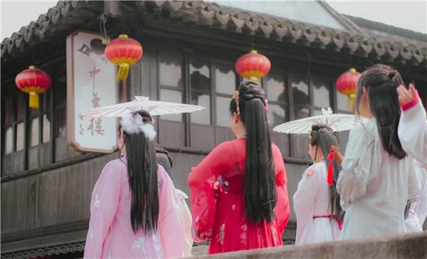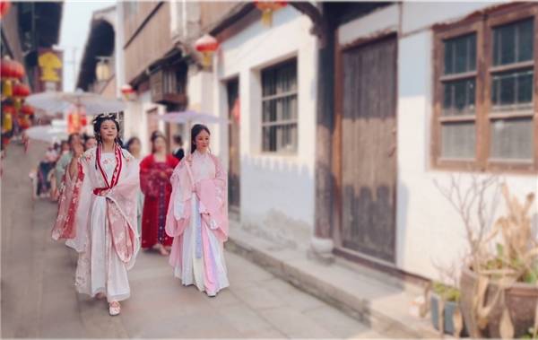 披罗衣之璀粲兮,珥瑶碧之华琚”。当队列整齐的国风巡游队伍走过白墙青瓦的主街、小桥、深巷,穿过石笋里门牌坊再到水云间,一路上吸引游人不时驻足拍摄发圈,惊呼仙女下凡。其盛况似乎穿越时光,还原了千年前的新场古镇。与汉服的相遇,恰如一场浪漫的邂逅,让人倾心不已。国风丽人们的风雅端庄,微风吹拂清秀罗裳,举手投足频笑回眸间无不展示着东方文化的韵美,令人们心笙摇曳。国服之美如同一曲曲传唱千年的歌谣,融合着唐诗宋词的深厚气韵,流淌着华夏国风的傲人风骨。沉浸式国风体验伴随着熙攘民乐,不觉让人沉浸于盛世的富庶安康中。