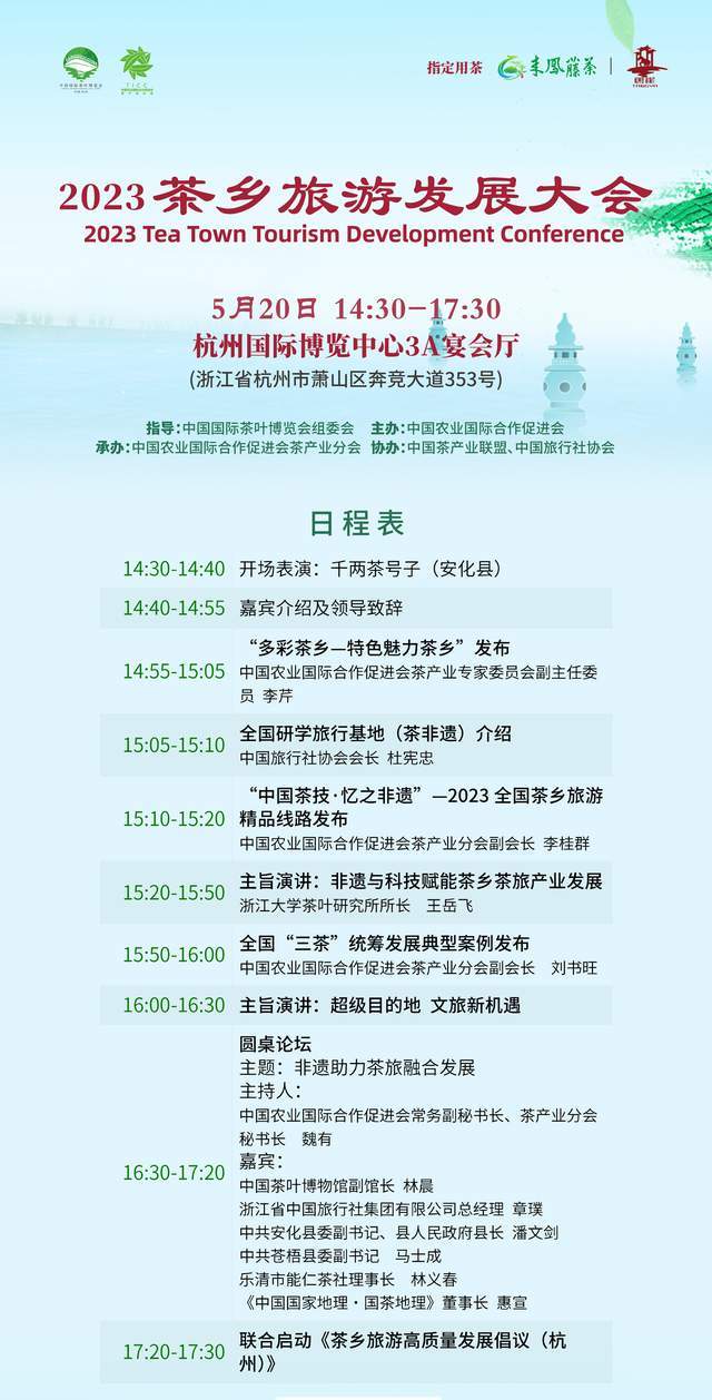 接上级部门通知,原定于5月21日上午举办的2023茶乡旅游发展大会,时间调整为5月20日下午举办,活动地点不变:杭州国际博览中心3A宴会厅。请参会嘉宾知晓,因时间调整,给各位带来的不便敬请谅解。