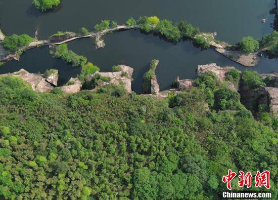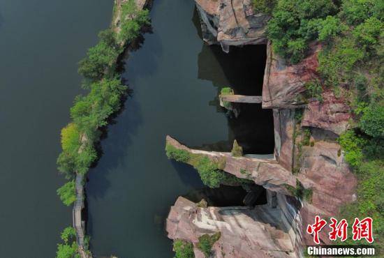 东湖因山而生,因石而奇,因水而美。湖中崖壁千寻,水色深黛,园林雅静,巧夺天工之奇观,吸引各地游客。图为航拍东湖景区的悬崖峭壁与奇谭深渊。王刚 摄