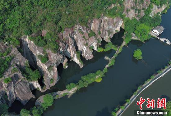 水上悬崖峭壁,水下深渊奇谭……在浙江绍兴东湖,自汉代起石工凿山取石的青石山在千年后遗留下独特景致。图为航拍东湖景区。王刚 摄