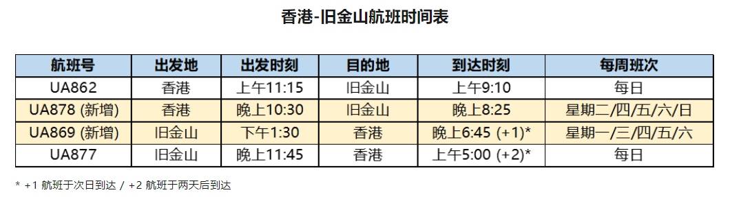 自8月3日起,美联航香港-旧金山的直航航班由每日一班增至每周12班,并将于10月下旬增至每周14班,即每日两班。美联航也是目前唯一一家运营香港往返美国直飞航线的美籍航司。