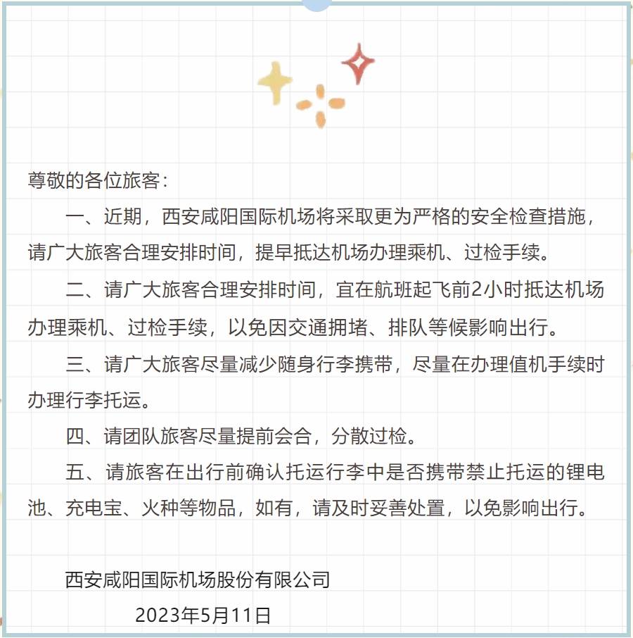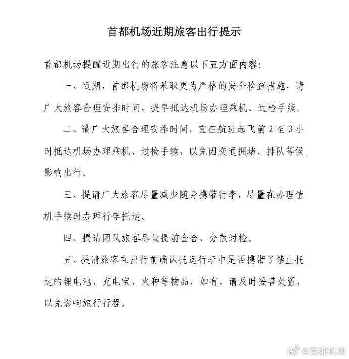 北京首都机场、大兴机场、成都双流机场、天府机场、海口美兰机场、西安咸阳机场以及鄂尔多斯机场相继发布提醒,将采取更为严格的安全检查措施。多家机场表示,旅客朋友们宜在航班起飞前2至3小时抵达机场办理乘机、过检手续,以免因交通拥堵、排队等候影响出行。
