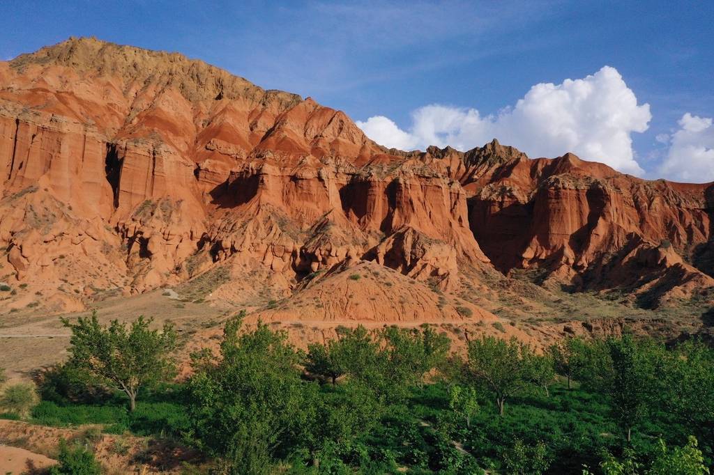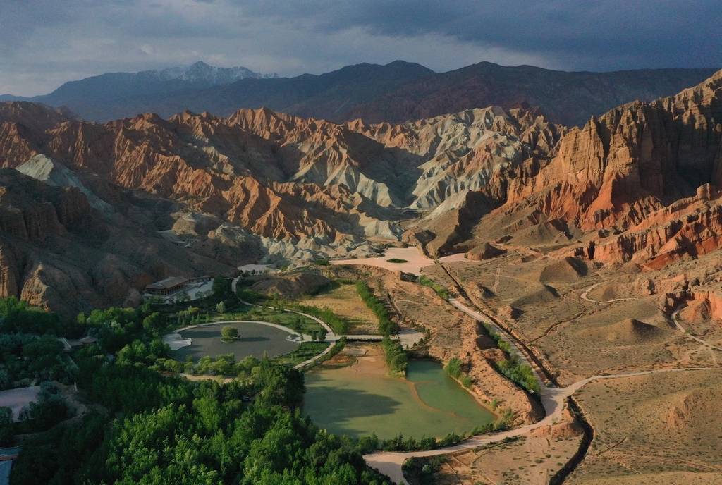 初夏时节,青海省贵德县绿意盎然,其境内的丹霞地貌在绿植的映衬下显得更为绚丽多彩。
