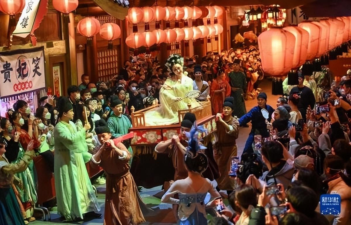 2022年12月31日,游客在陕西西安长安十二时辰主题街区观看表演 图源:新华社