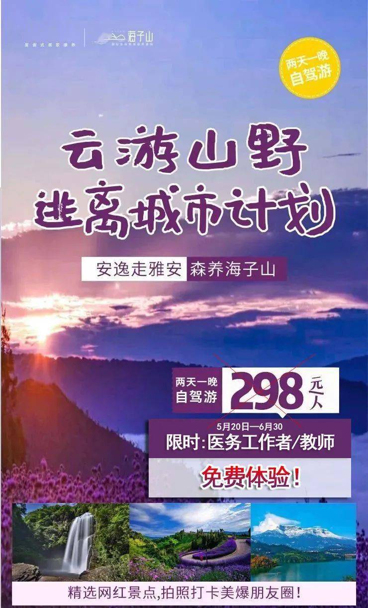 5月20日~6月30人感恩回馈活动:医护人员、教务客户群体40岁以上的提供教师证/工作证明,可享受免费体验海子山3天2晚考察团(除周五周六)含酒店及早餐。