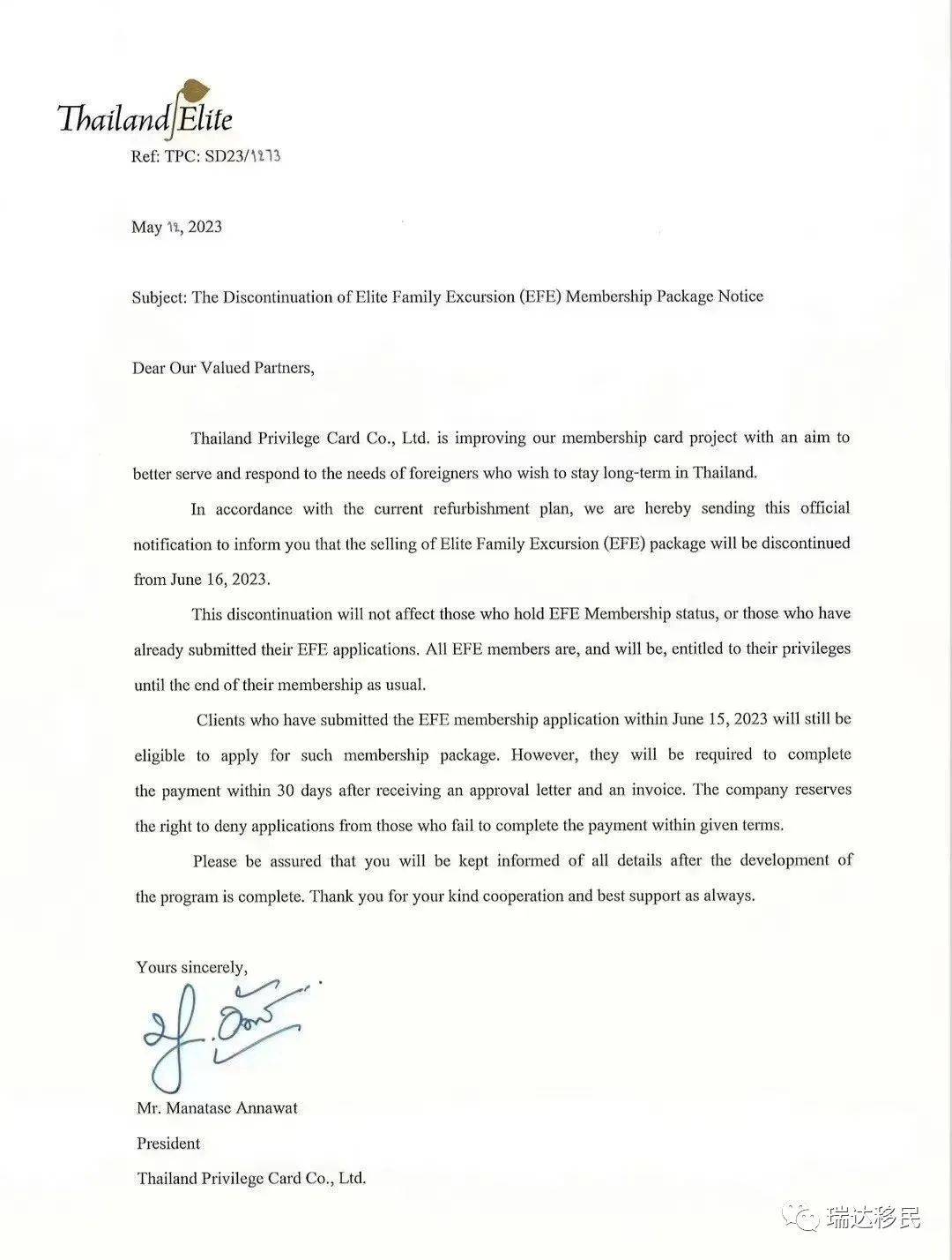 根据最新消息,泰国精英签证EFE五年家庭卡套餐将于2023年6月16日正式取消。已经持有该卡别的会员或正在申请该卡别的客户不受影响,2023年6月15前申请EFE家庭卡别的客户仍然可以正常递交。