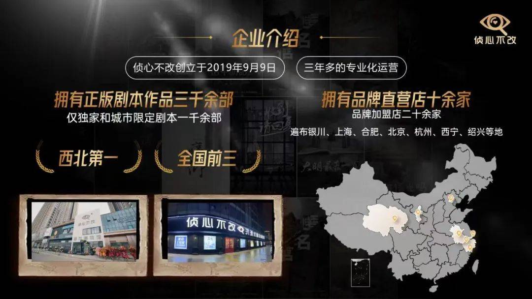 |侦心不改创立于2019年9月9日,是中国剧本娱乐行业头部品牌,拥有正版剧本作品三千余部,其中仅独家和城市限定剧本一千六百余部,稳居西北第一,全国前三。侦心不改剧本工作室原创作品《孤岛喋血》《失控的荷尔蒙》《塔中阴影》《匿名信》《山海》《春夏秋冬》《凛冬将至》《贺兰宴》《大明最后一页》《痛仰》《天玄》等接连创下销售新高。更值得期待的是,这次为看见贺兰量身定制了一套全国首创线上线下同步交互式剧本,相信会带给你独一无二的解谜之旅。