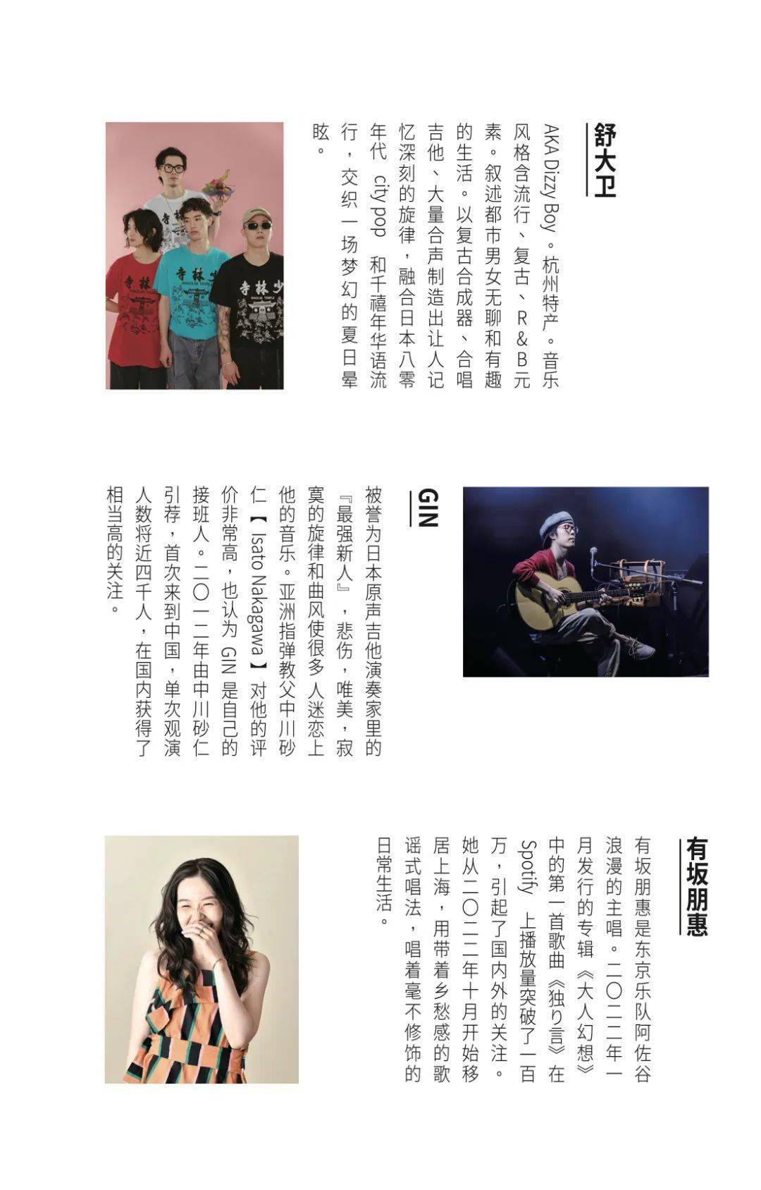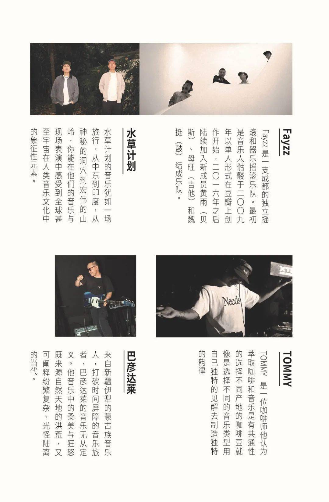 其中乐队和音乐人包含了来自成都的独立摇滚和器乐摇滚乐队:Fayzz、长居北京的音乐组合:水草计划、新疆伊犁的蒙古族音乐人:巴彦达莱、杭州独立音乐人:舒大卫、日本原声吉他演奏家:GIN、东京乐队阿佐谷浪漫的主唱:有坂朋惠、以及同为咖啡师和音乐人的:DJ-Tommy。