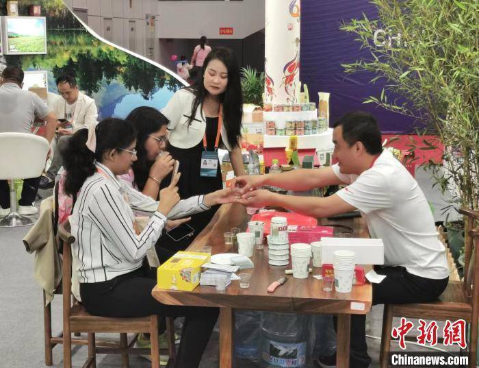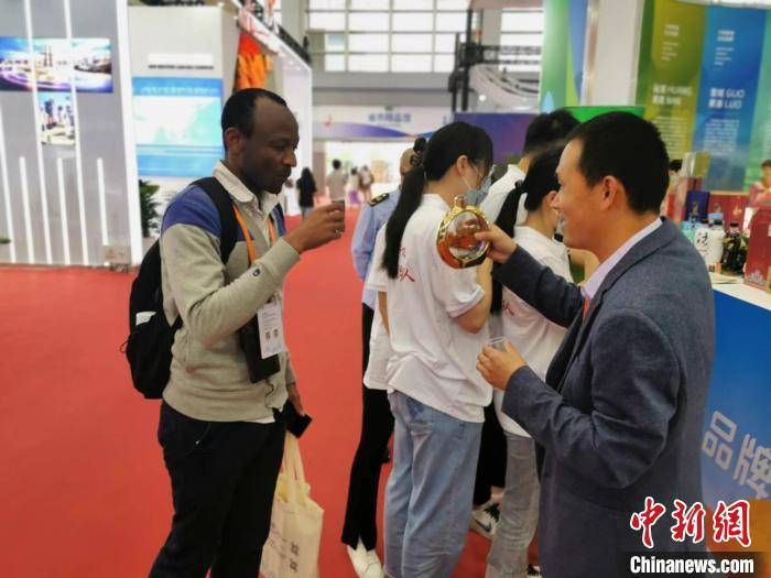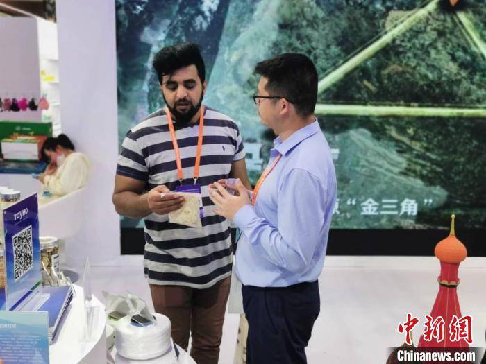 青海馆内,工作人员向外籍参会者介绍当地产品。 王逸飞 摄