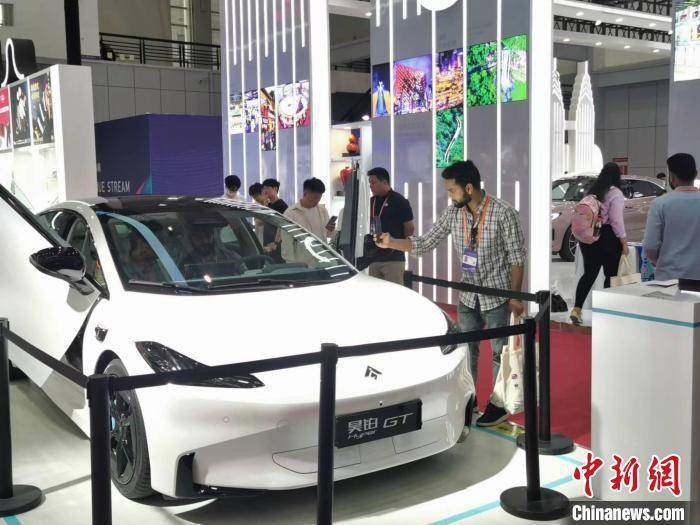 两位外籍参会者在一款汽车产品前合影。 王逸飞 摄