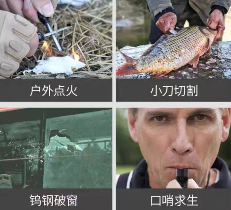 其实这款的场景和功能很丰富,除了户外点火外,还可以作为小刀切割、钨钢破窗、口哨求生等使用。