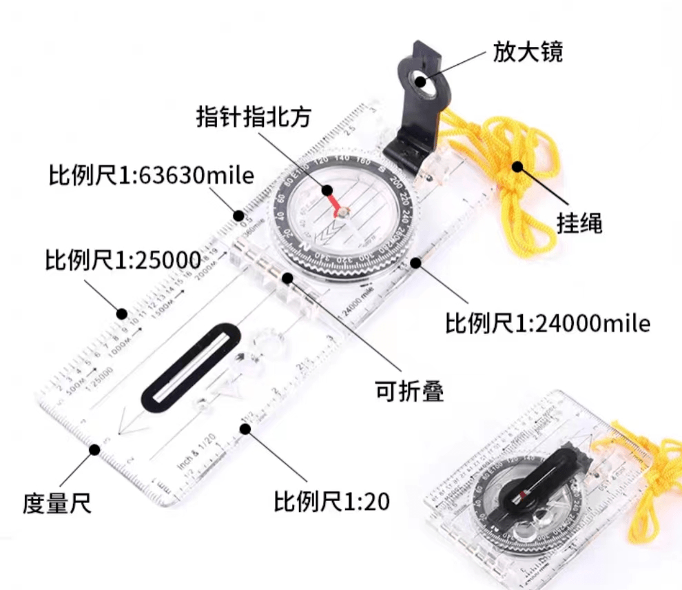 首先,它不仅仅是个指南针,放大镜、挂绳、指北针、比例尺、度量尺等功能都有。