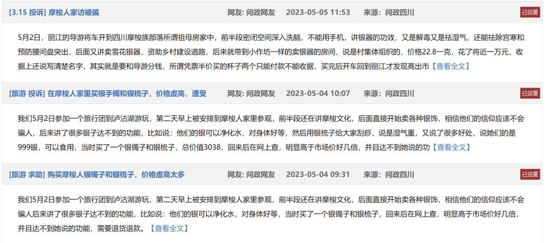 近日,多条“跟团去泸沽湖旅游,被以‘药银’名义骗买银器”的投诉举报信息出现在“问政四川”平台。多名游客投诉称,在四川凉山州盐源县泸沽湖景区旅游途中,被人引导购买了“药物浸泡过的银饰品”(药银)。此后,游客感觉自己“上当了”,要求商家退货退款。