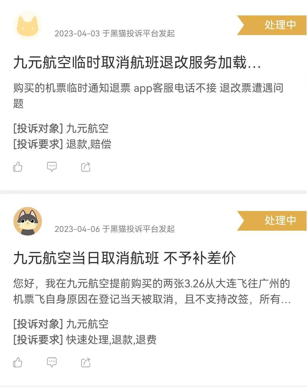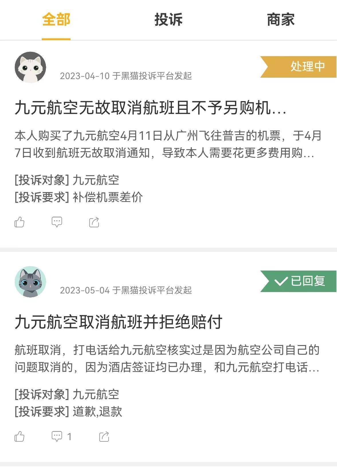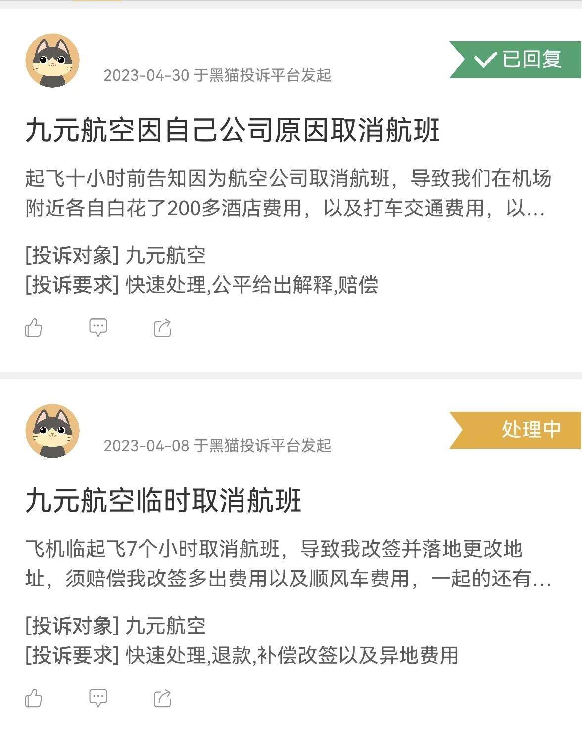 记者看到,在黑猫投诉平台上,投诉编号为1736610****的用户也表示,近日收到九元航空公司由于“公司原因”临时取消航班的通知,且同样无法改签当天其他航班,只能临时购买其他航司的机票。该用户称,希望九元航空赔偿机票差价,但周旋一个月未果。
