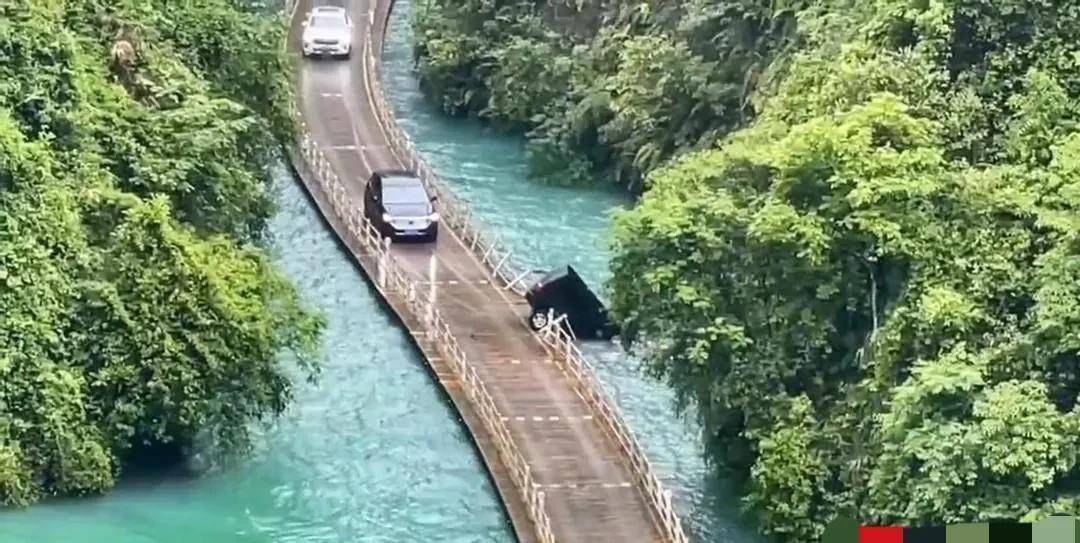 5月16日,湖北恩施狮子关景区网红浮桥出现旅游观光车坠河事件。一辆黑色载有8人的旅游观光车经过网红浮桥时,由于近日暴雨天气,水位上涨原因,导致浮桥上下浮动,水花四溅,甚至浮桥上出现漫水。在转弯时,前面上下波动,导致司机控制不住,一头冲出护栏,车头扎进了水里,后半车身挂于浮桥上。