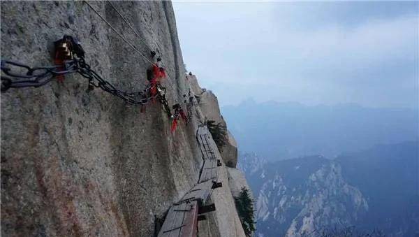 华山长空栈道位于渭南市华阴市,处于海拔2160米的高度,是华山最独特的标志,被列为全球十大最恐怖的悬崖步道之一。华山长空被誉为最陡峭恐怖的天下第一险的,长空栈道位于华山南峰东侧山腰,是华山派第一代宗师元代高道贺志真为远离尘世静修成仙,在万仞绝壁上镶嵌石钉搭木椽而筑。栈道上下皆是悬崖绝壁,铁索横悬,由条石搭成尺许路面,下由石柱固定,游人至此,面壁贴腹,屏气挪步,被誉为“华山第一天险”。长空栈道有700余年的历史,长空栈道是华山险道的险中之险