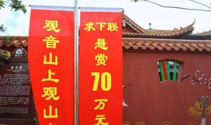 而门口赫然挂着半幅对联——观音上观音水,下联则是写着“征求下联悬赏70万”,据说此征集对联的活动是从2015年开始的,活动一出吸引许多佳人才子进行了暴风式的投稿,可惜最终都没有对上景区的“胃口”。