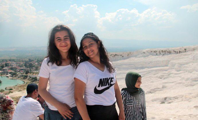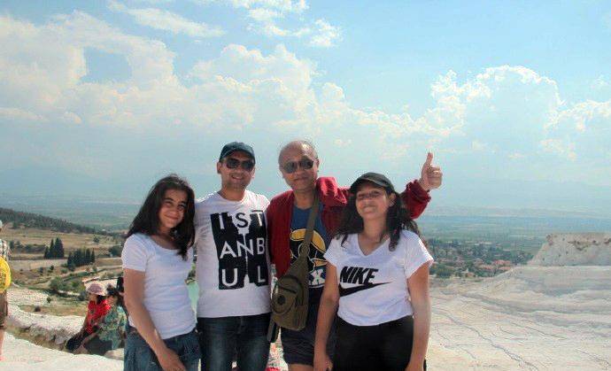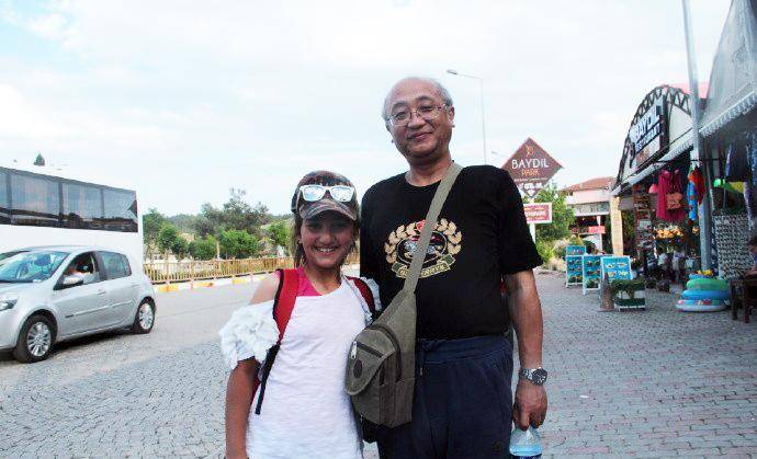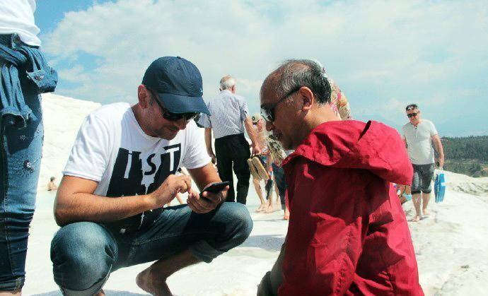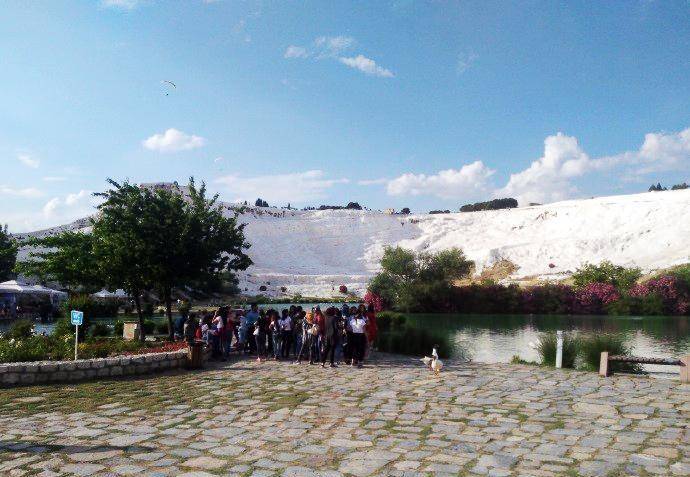 在棉花堡遇见一群中学生。最初有两位女孩在拍照,我们也给她们拍照。她俩见状便要求和我们合影,并报告了他们的老师。老师走过来和我打招呼,先用英语问我来自哪个国家,我说我来自中国北京,他显得高兴了起来,用手机谷歌翻译软件和我交谈。他说他们来自艾登堡,离这里有120公里。我说我到土耳其才五、六天,就已经喜欢上了这个国家,喜爱这里的人民。他显得更高兴了,叫上那两位女学生和我合影。