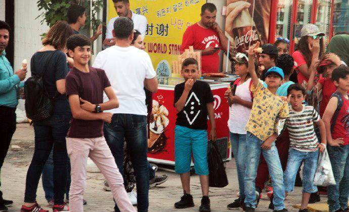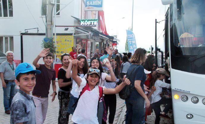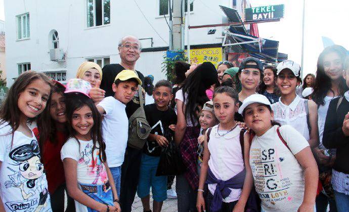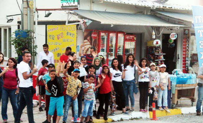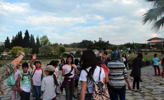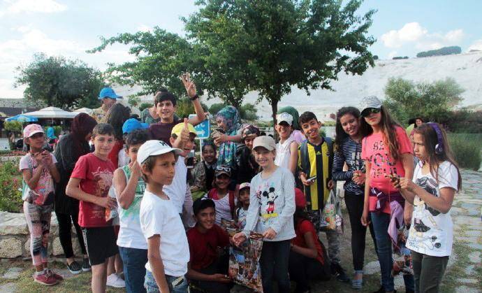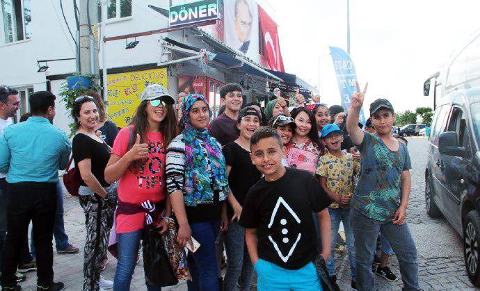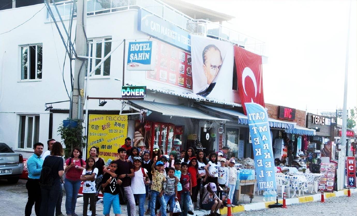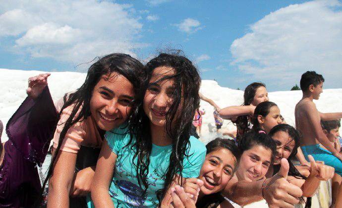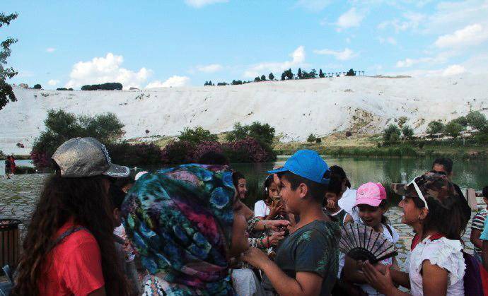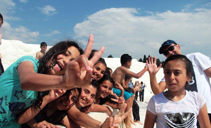 我们从另一个景点再次返回棉花堡,停车在山下便利店买矿泉水时,又遇见了这群中学生。他们在马路对面的一个冰淇淋摊位买冰淇淋,认出我们以后,又是一阵欢叫,挥手让我们过去合影。孩子们摆出各种姿势要求拍照,更有个小女孩冲到镜头前,要求给她照特写。他们把我们围在中间,我本以为要照大合影,结果发现孩子们把我们埋了起来,从外围根本看不见我们的人影。他们欢叫着什么,好像在说,我喜欢你,你长的真漂亮。直到接他们的大巴来了,我们才分手。这场景真是让人难忘。土耳其导游后来说,就像你们看他们是外国人那样,在他们眼里你们也是外国人,所以对你们充满了好奇。