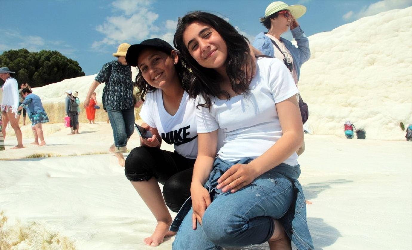 远处是棉花堡。右边两位白衣女孩是在山顶和我合影的那两位。这是我在远处无意间拍的照片,走近以后才认出来