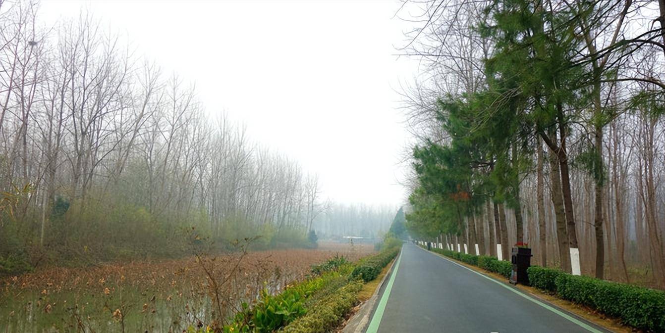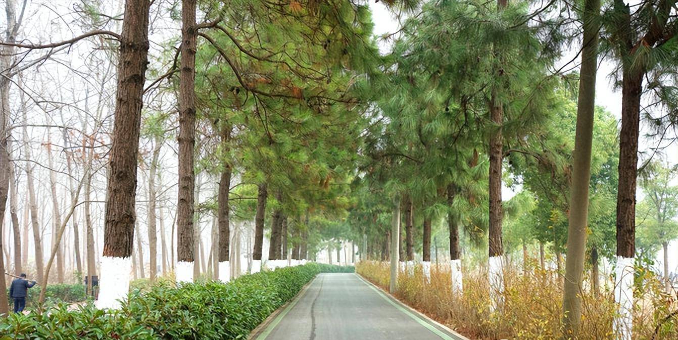 焦姑路上两侧高大的松树下,一侧灌木,一侧芦苇。