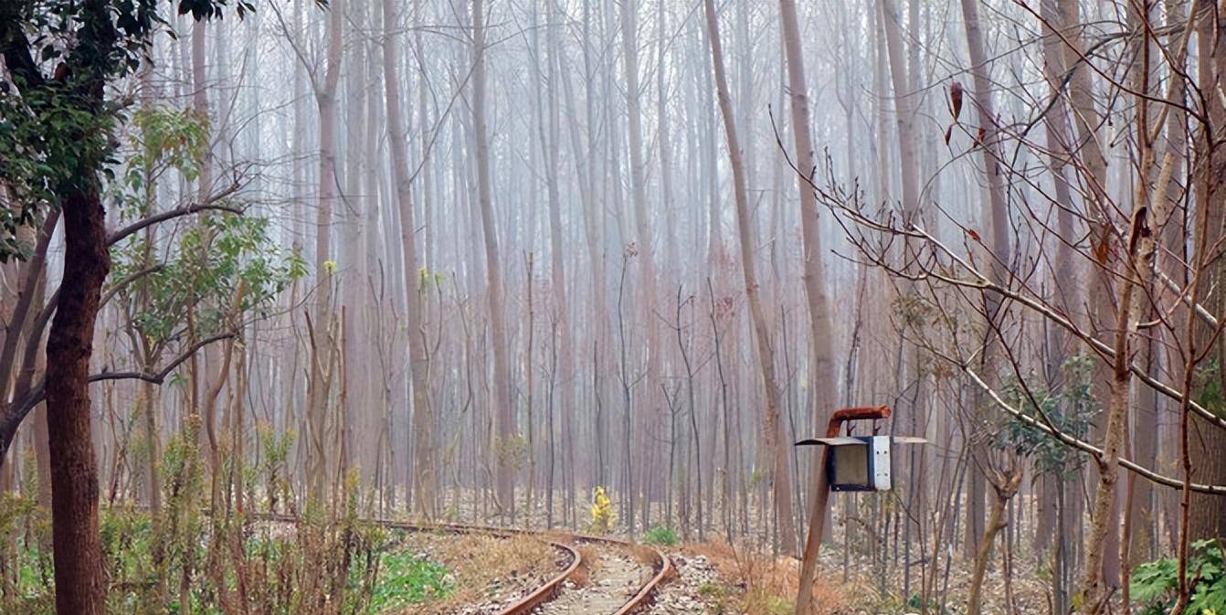 静穆中突闻水流叮咚,层林叠嶂中一慕惊水顺山涧流淌入塘,如珍珠落玉盘那般叮当作响。木制小桥曲通八角亭。此乃荷塘落玉是公园荷花观赏区。这个季节满池的荷叶杆。夏日里那荷花争奇斗艳之势只能凭空想象了。