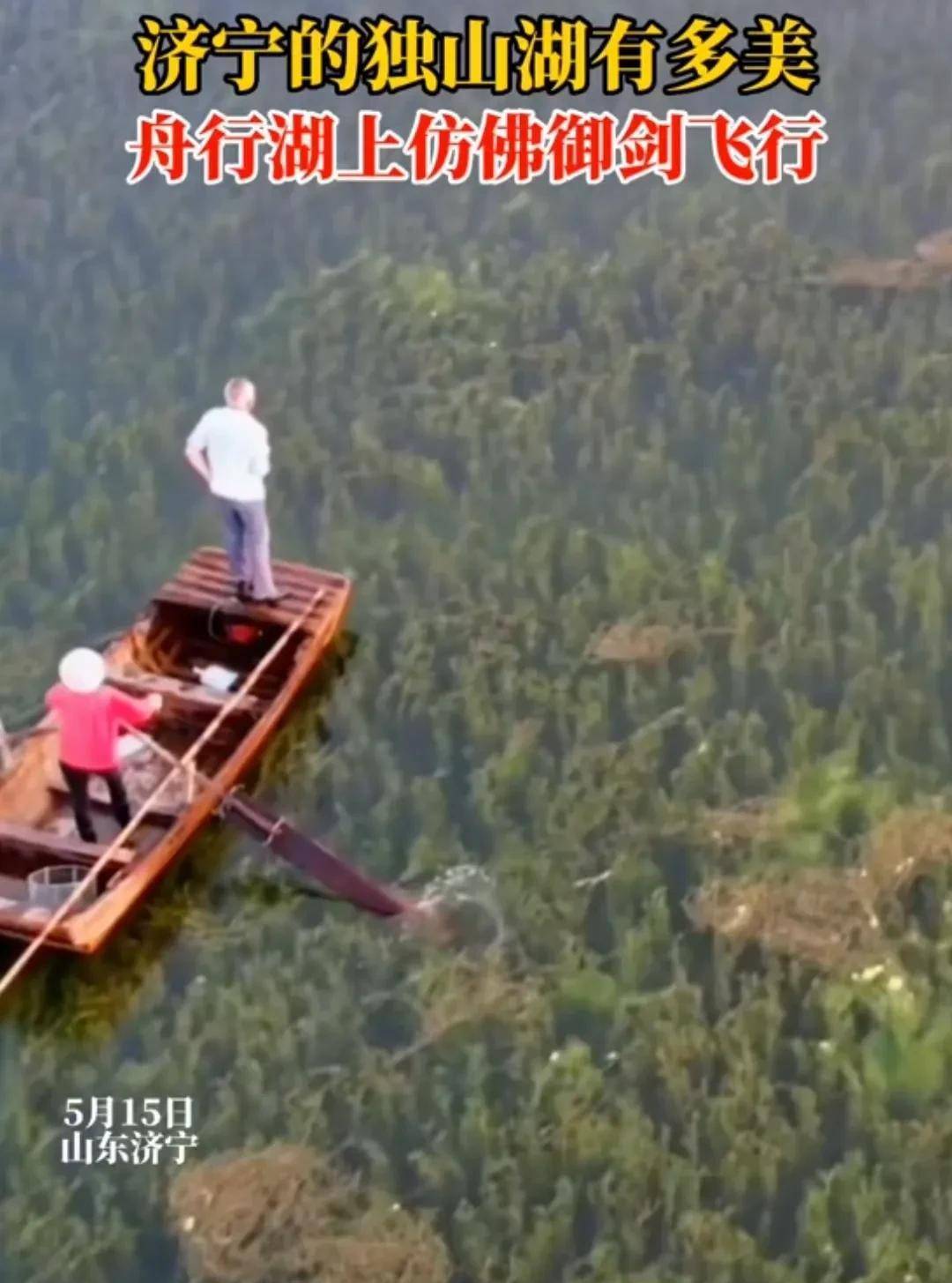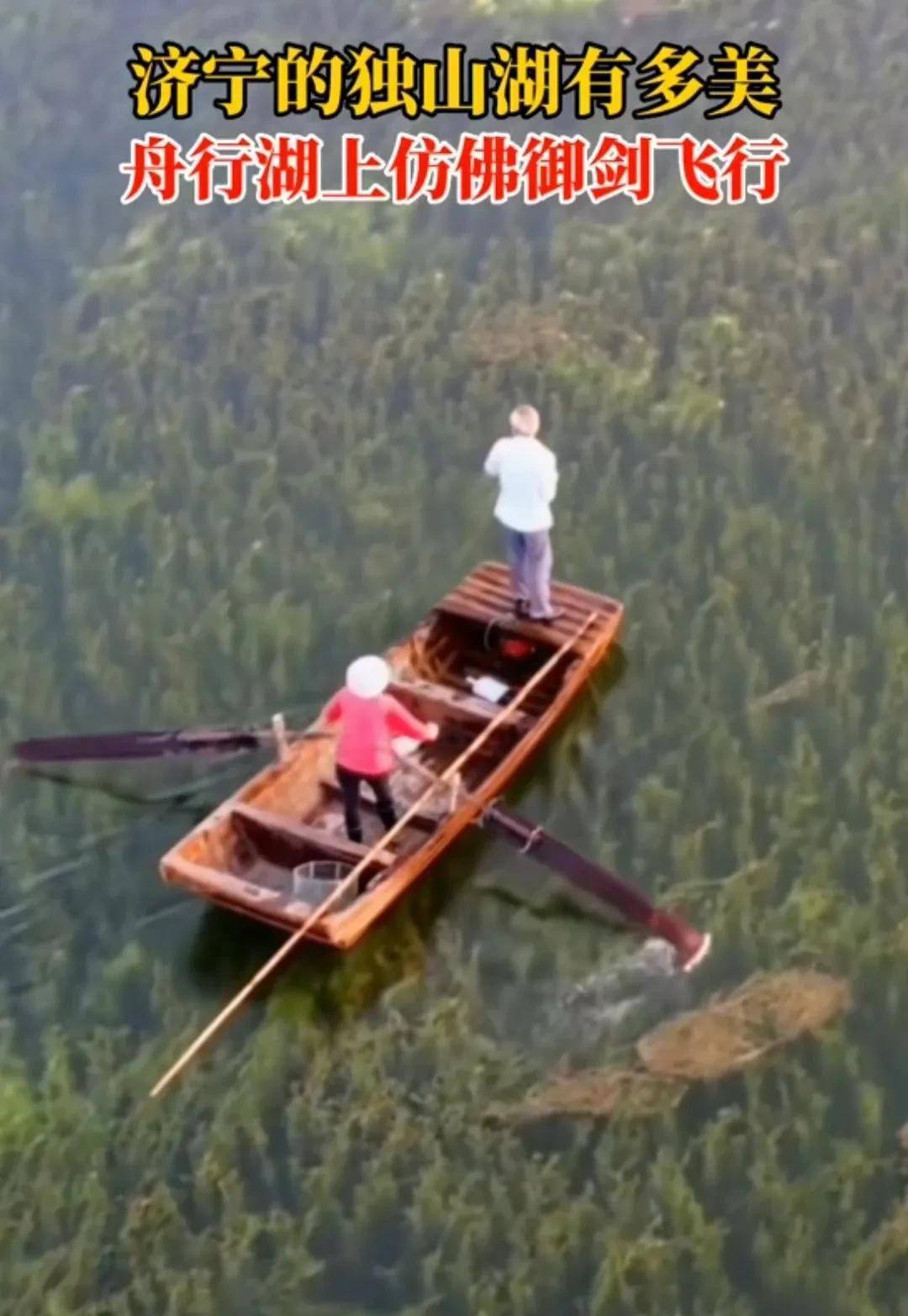 济宁的朋友们这两天应该都刷到了一条济宁独山湖泛舟湖面的高空俯拍视频,两位老人划船在湖面上,湖中的水草在清澈的湖水中看的一清二楚,行驶中的小船仿佛御剑飞行。
