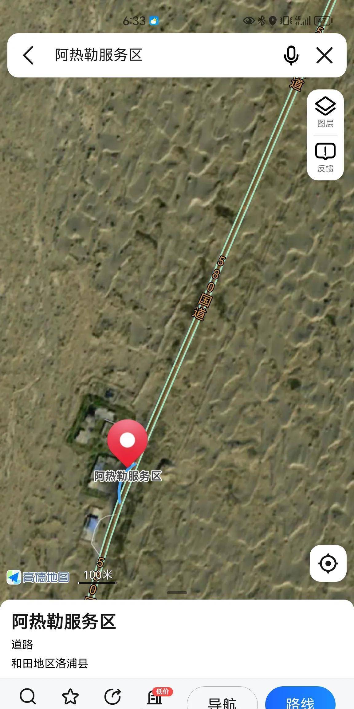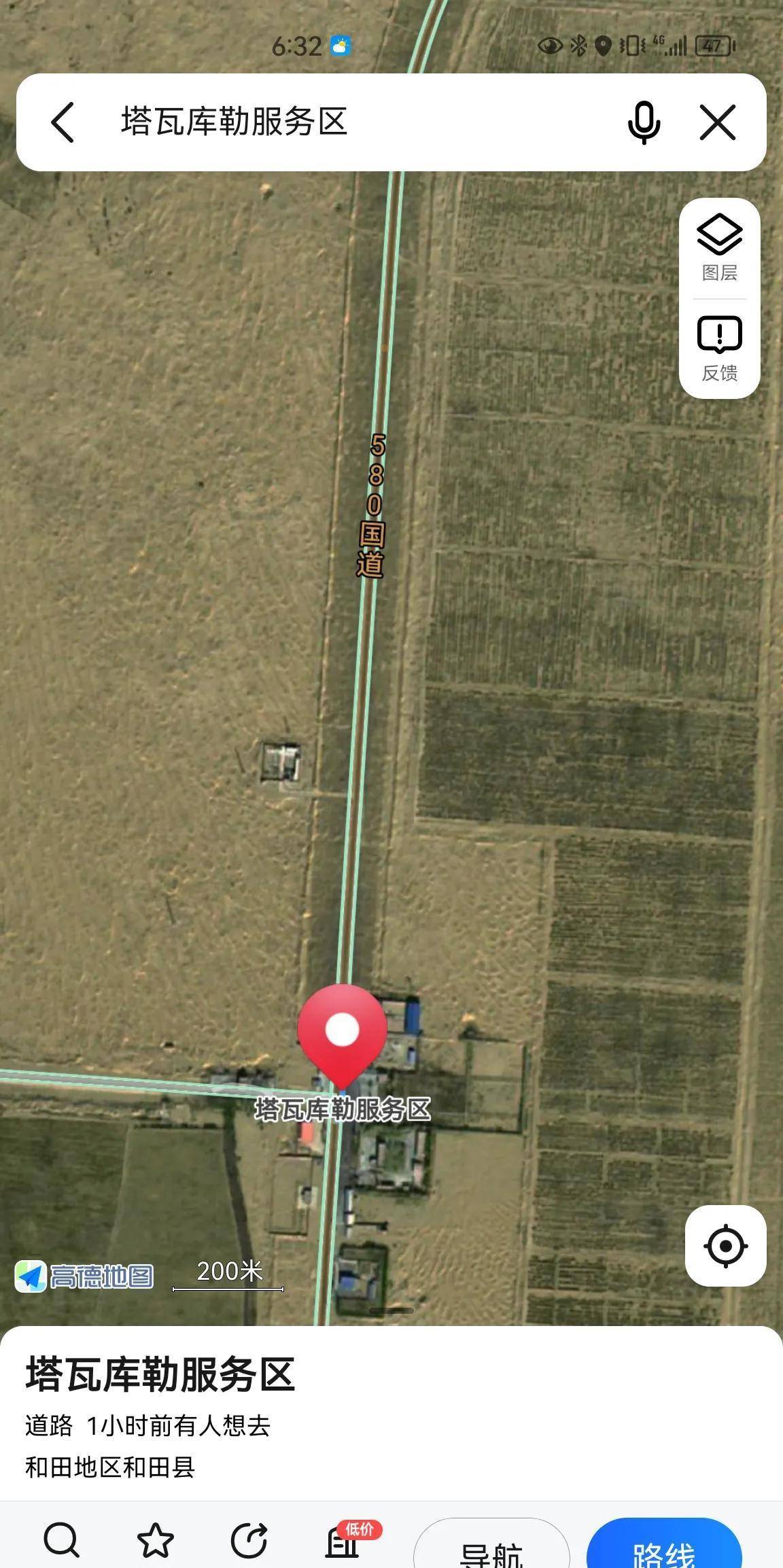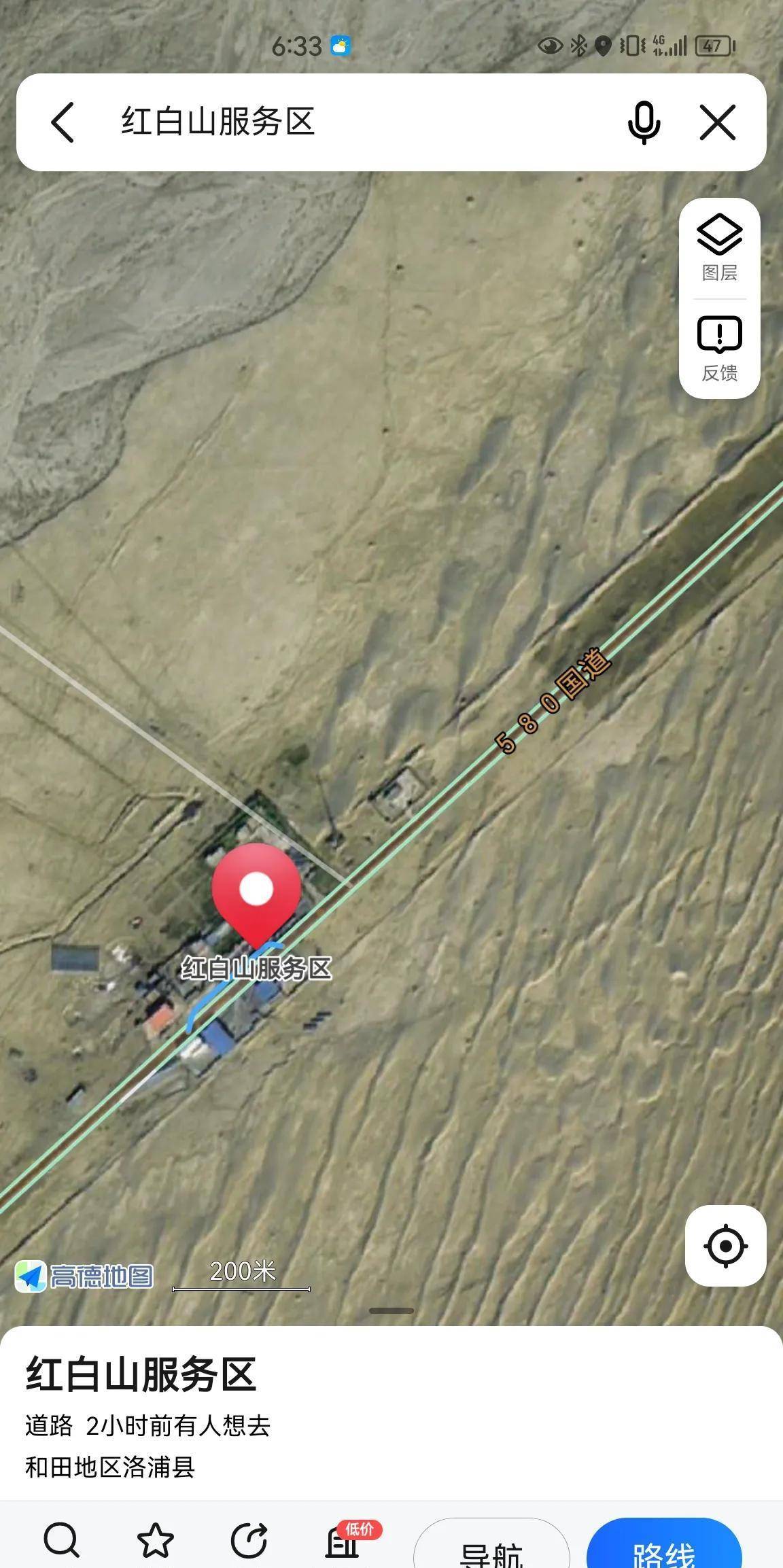百度可以查到:580国道于2007年建成通车,基本上每隔100公里左右就会有1个服务区可以休息吃饭,从和田到阿拉尔的服务区距离如下1.和田——塔瓦库勒服务区,82.4公里。2.塔瓦库勒服务区——红白山服务区,105公里。3.红白山服务区——阿热勒服务区,131公里。4.阿热勒服务区——阿拉尔,139公里。如果不知道这几个服务区的名字,不专门查的话,地图上确实不显示,好奇怪。