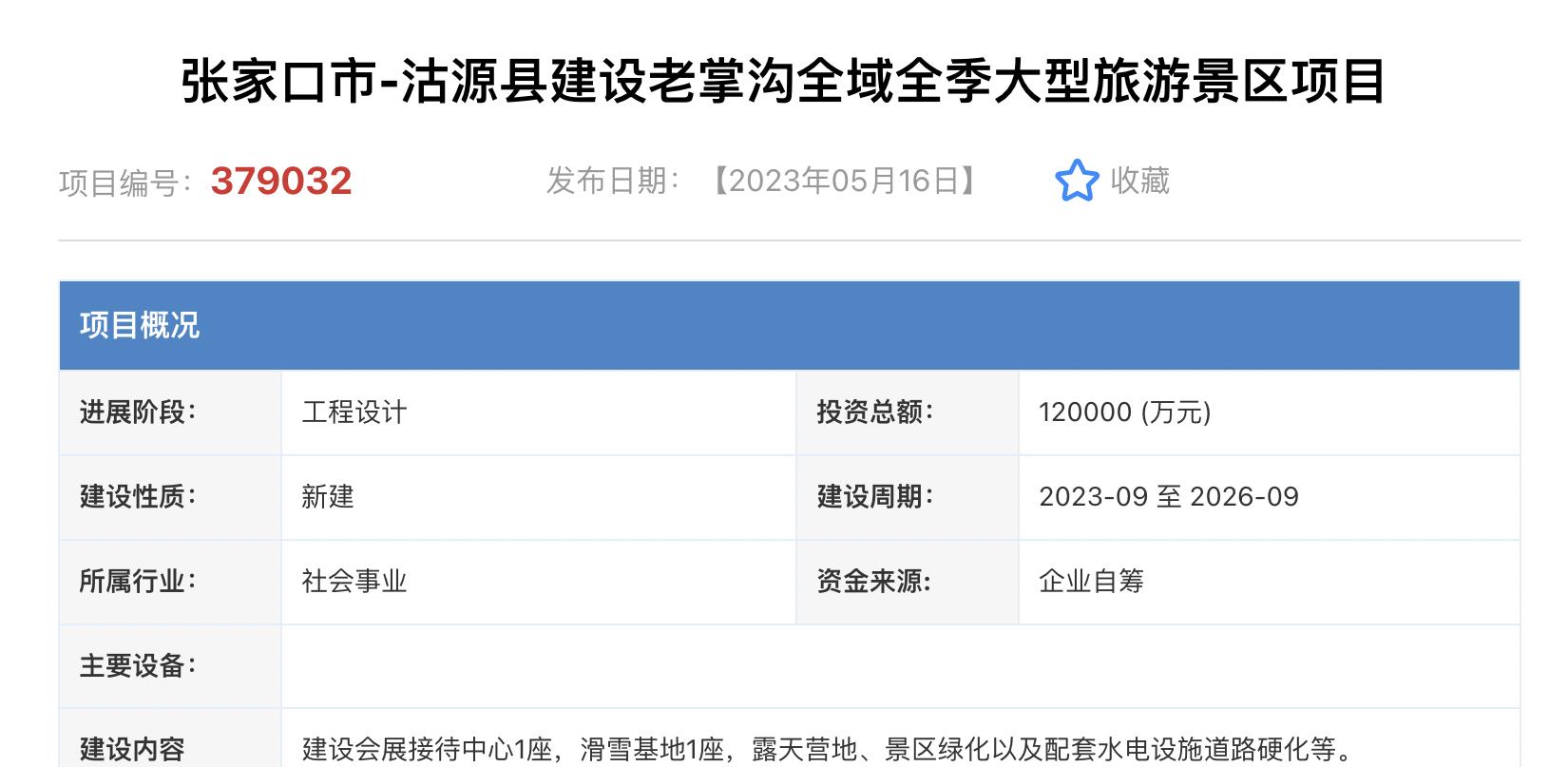 沽源县建设老掌沟全域全季大型旅游景区项目,投资120000 (万元),预计今年9月开工,2026年9月建成。