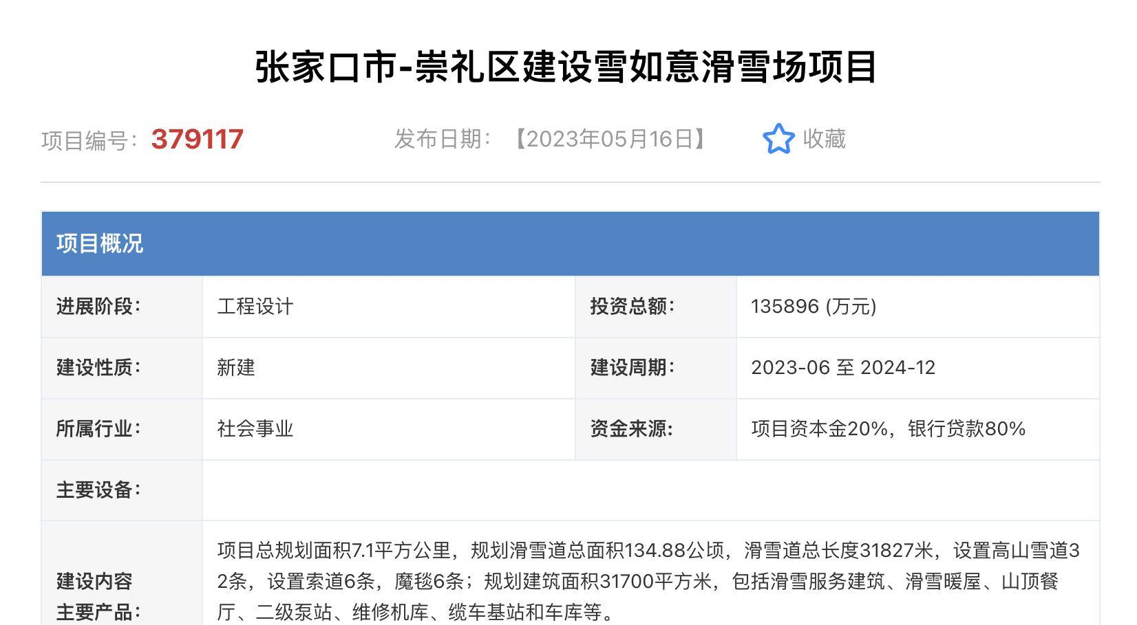 今天又公布张家口雪如意要建滑雪场。投资135896 (万元),预计今年6月开工, 2024年12月建成。