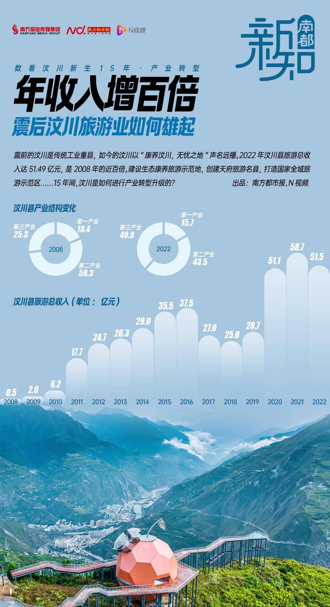 15年,从0.5亿元到51.49亿元,汶川县旅游业在震后是如何雄起的?南都新知以水磨镇为样本带你一窥究竟。