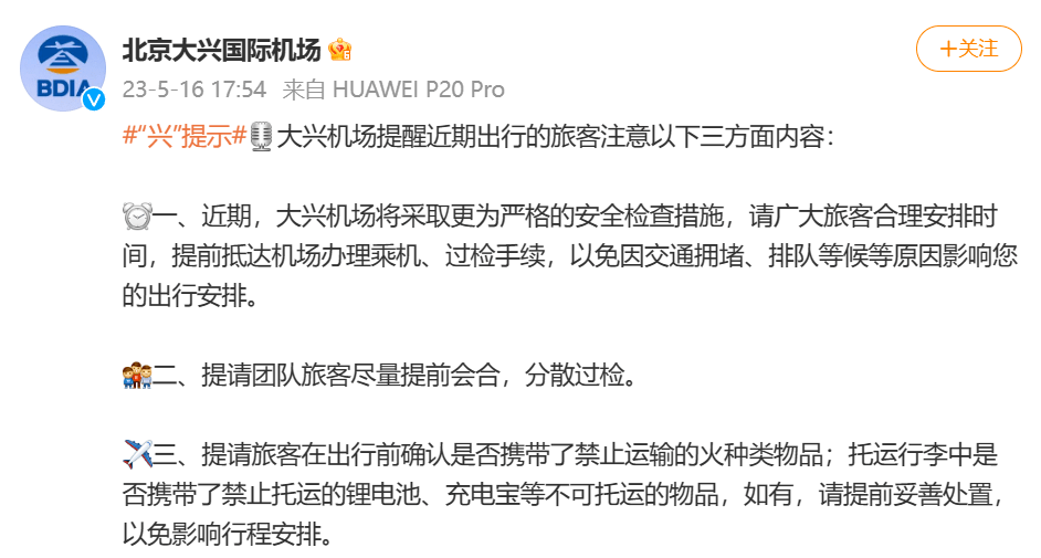 北京大兴机场也发布提醒称,近期将采取更为严格的安全检查措施,请广大旅客合理安排时间,提前抵达机场办理乘机、过检手续,以免因交通拥堵、排队等候等原因影响出行安排。