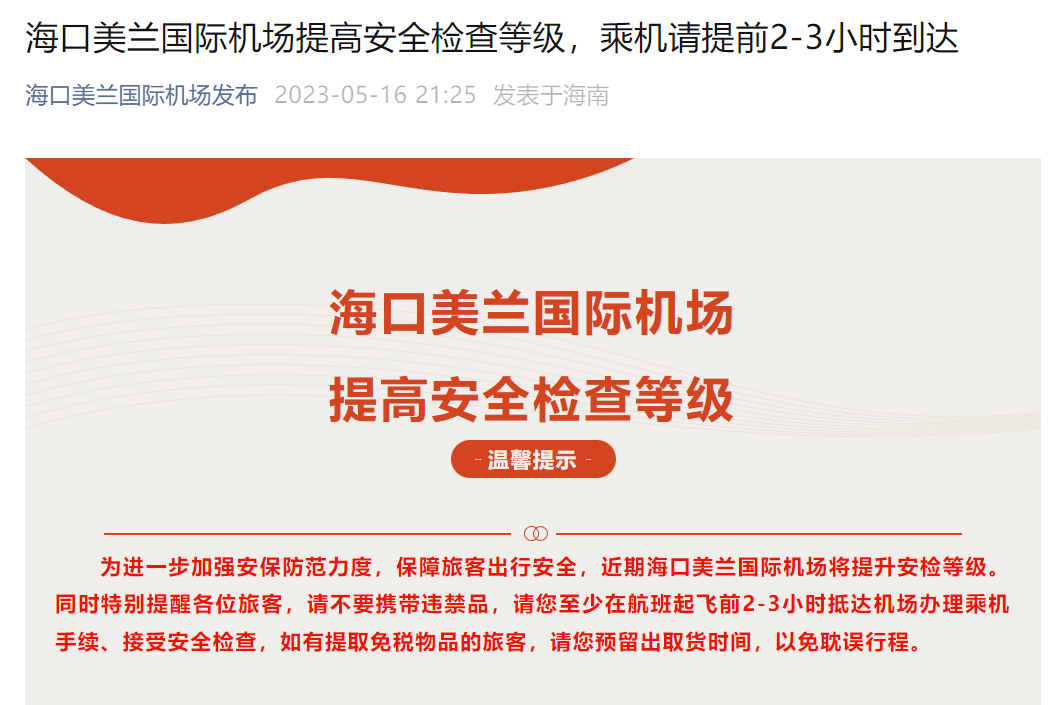 据“海口美兰国际机场发布”16日消息,为进一步加强安保防范力度,保障旅客出行安全,近期海南海口美兰国际机场将提升安检等级。同时特别提醒各位旅客,请不要携带违禁品,请您至少在航班起飞前2-3小时抵达机场办理乘机手续、接受安全检查。