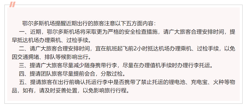 5月16日,内蒙古鄂尔多斯国际机场发布提示: 近期,鄂尔多斯机场将采取更为严格的安全检查措施,请广大旅客合理安排时间,宜在航班起飞前2小时抵达机场办理乘机、过检手续,以免因交通拥堵、排队等候影响出行。