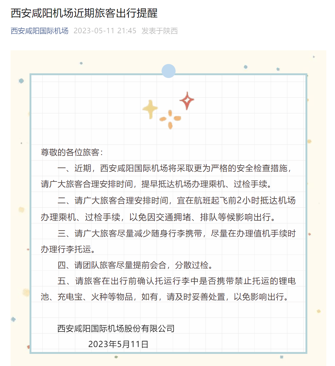 近日,西安咸阳国际机场发布提醒称, 近期将采取更为严格的安全检查措施,请广大旅客合理安排时间,宜在航班起飞前2小时抵达机场办理乘机、过检手续,以免因交通拥堵、排队等候影响出行。