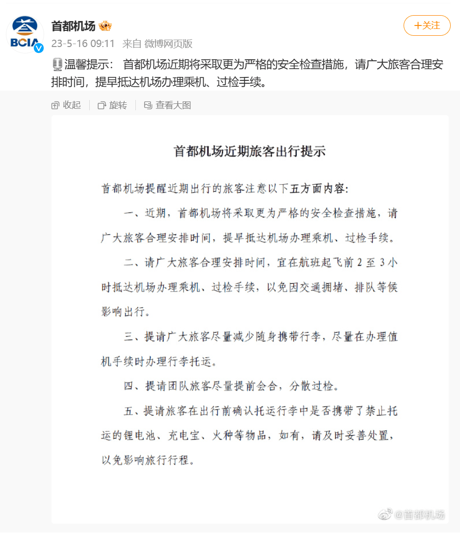 5月16日,北京首都机场官方微博发布一则提示称:近期,首都机场将采取更为严格的安全检查措施,请广大旅客合理安排时间,提早抵达机场办理乘机、过检手续。首都机场表示,旅客宜在航班起飞前2至3小时抵达机场办理乘机、过检手续,以免因交通拥堵、排队等候影响出行。