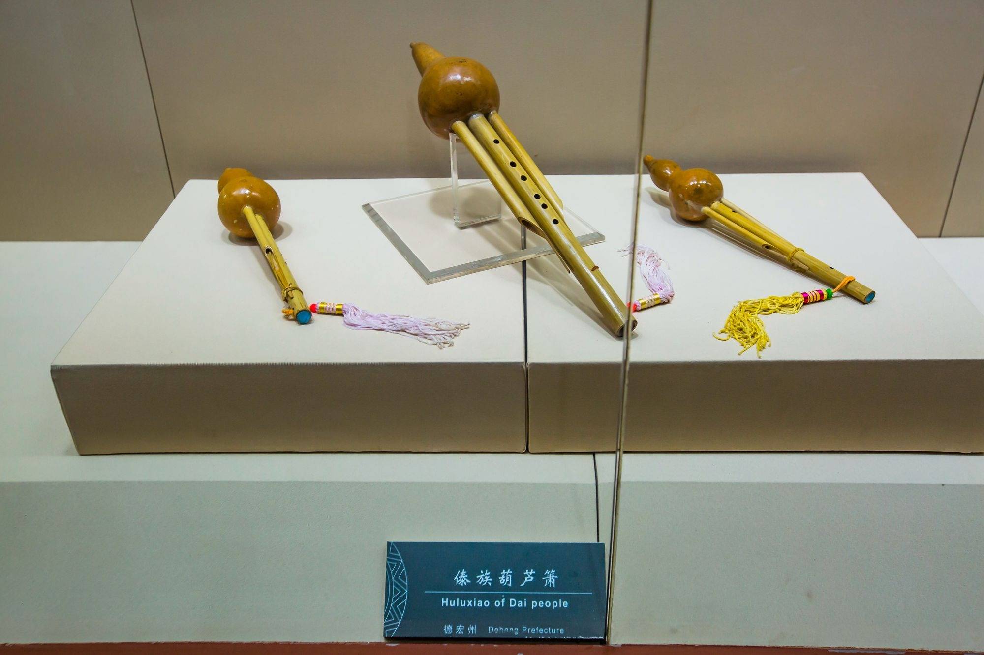 傣族葫芦箫的名字很形象,前端为一个完整葫芦,造型奇特。对于傣族、德昂族等少数民族来说,葫芦箫有点像80、90年代青春期男孩耍帅时怀中抱的吉他,小伙子用它来演奏乐曲、表达爱意,赢得姑娘的芳心。
