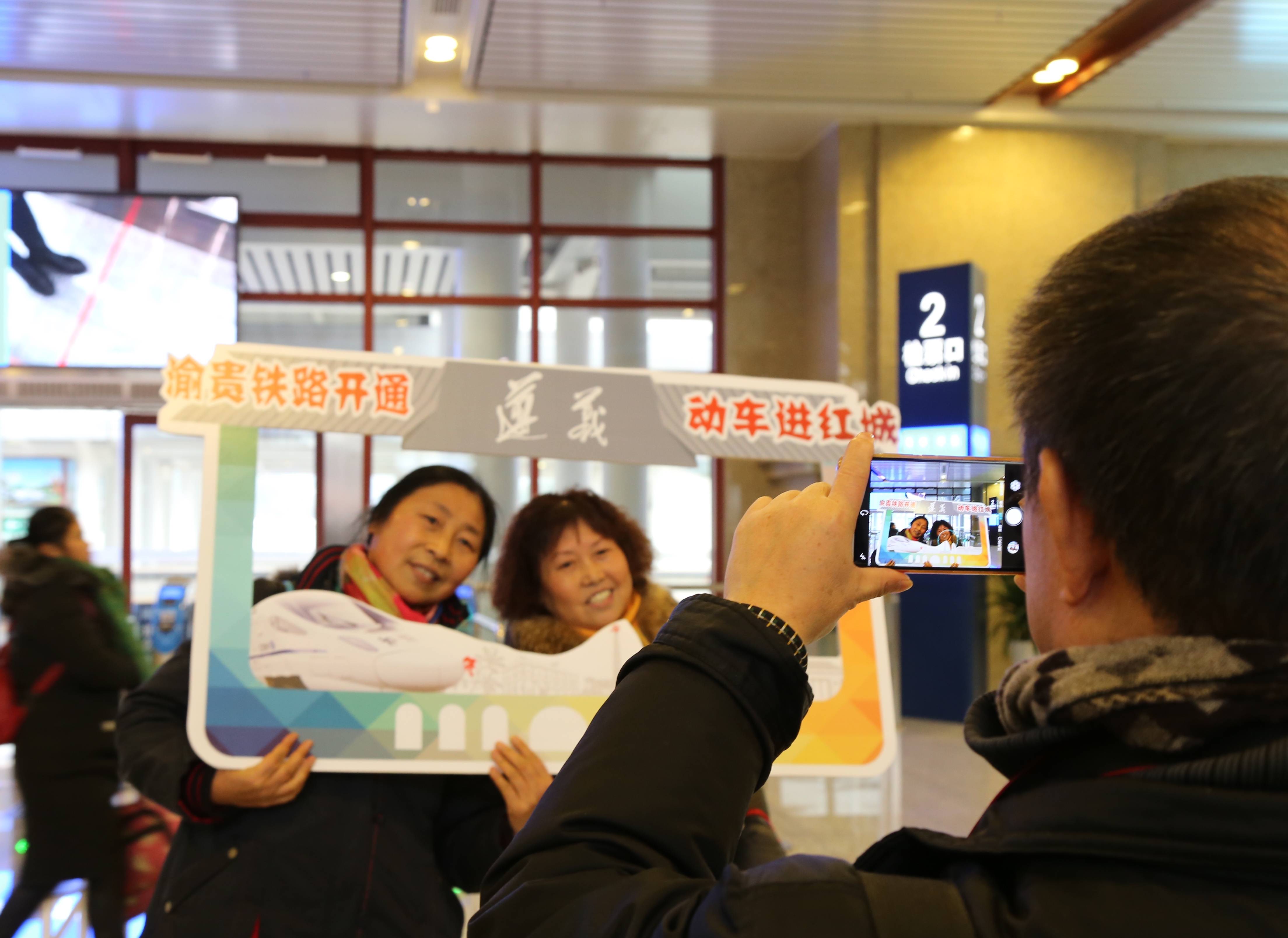 2018年1月25日,渝贵铁路开通,遵义车务段首次接管7个高铁车站。图为开通当日,旅客在遵义站合影。高大华 摄