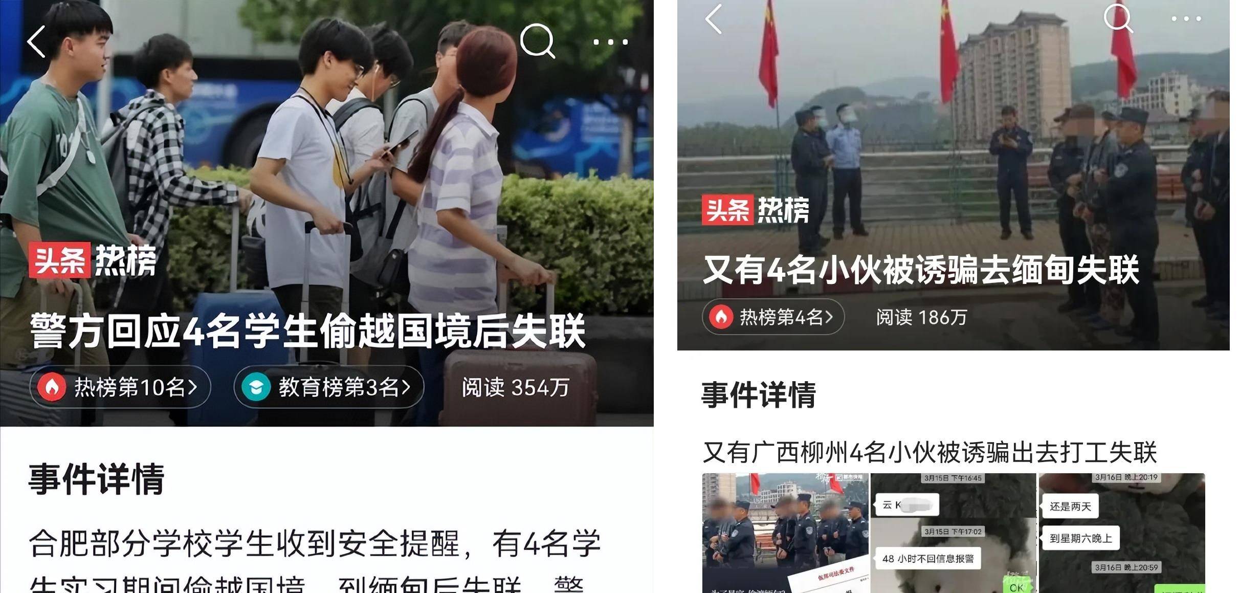 近日,先是曝出合肥某职校4名学生,偷越国境至缅北,目前已经失联。后是又爆出广西柳州4名小伙也被骗走到缅北了。