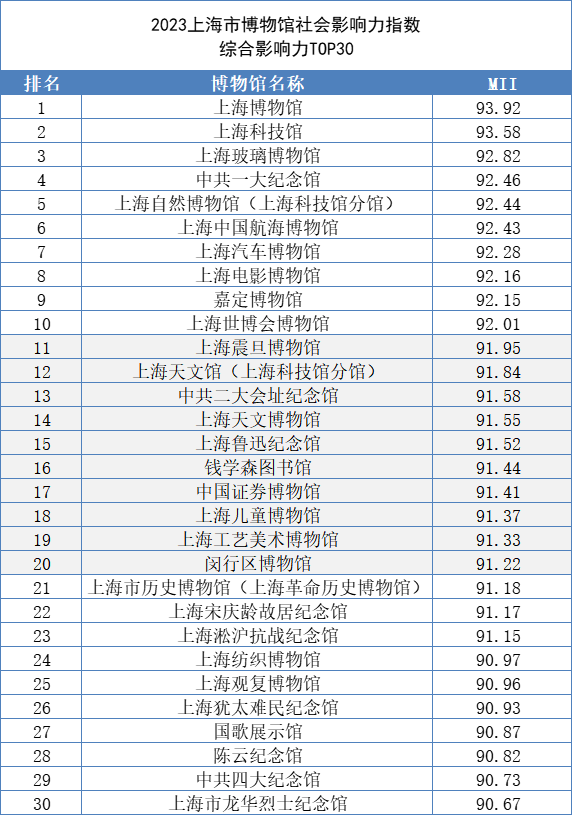 在“5·18国际博物馆日”来临之际,“上海市博物馆社会影响力指数(MII)”发布。其中包含总榜和多个分类及特色榜单。