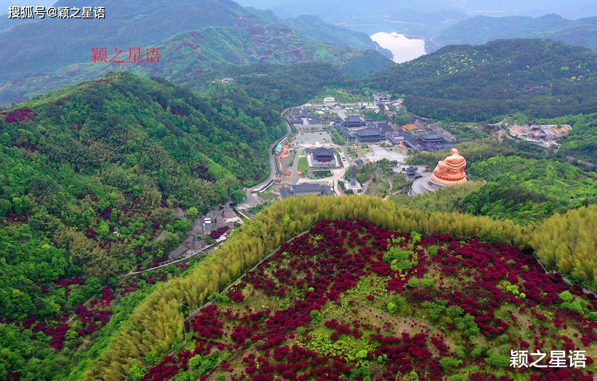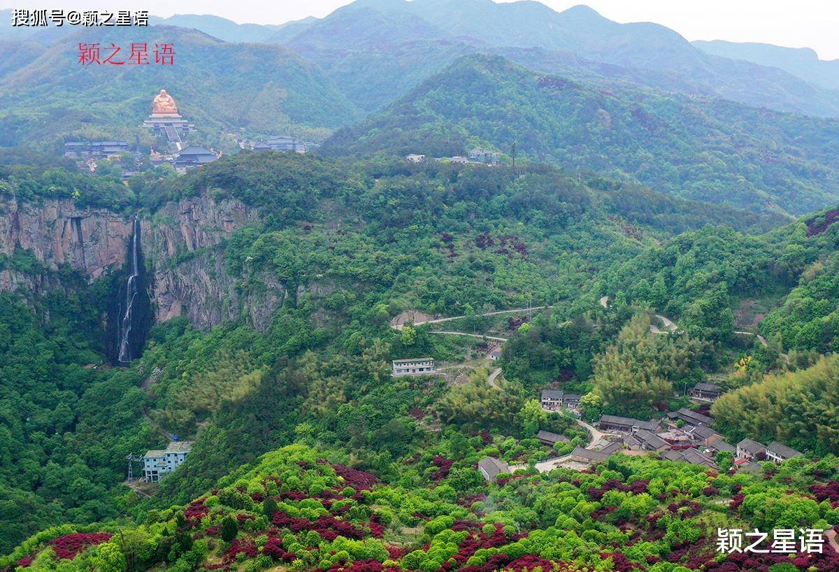从村后的山头,眺望雪窦寺方向,妙高台、千丈岩瀑布和弥勒大佛,完整呈现于同一个画面中,堪称完美的山水画。