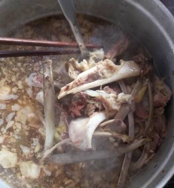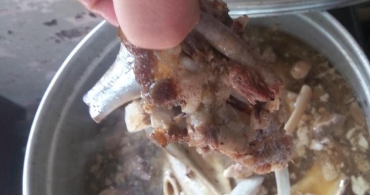 回到主题,熬制大骨头只需要加盐和十三香,至于鸡精、味精因为对身体不是太好而且容易改变肉食原味,所以在农村很不受欢迎。而且炖肉只能用家里的炭火,温火慢炖才有美味。如图,经过3小时的熬制,小火慢慢炖的羊肉已经脱骨,肉全部沉到锅底。