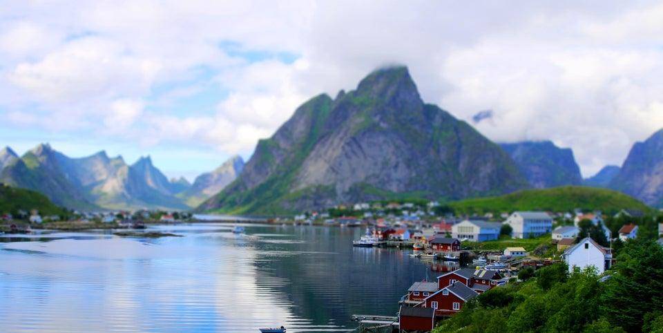 挪威罗弗敦小镇坐落在美丽的峡湾之间,鲜艳别致的建筑临水而建,看起来就像是拍电影时用到的微缩场景特效模型。