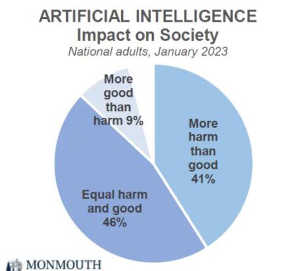 据美调研数据,只有9%的人认为人工智能利大于弊,46%中立,41%反对,大家最担心人工智能具有自我意识。