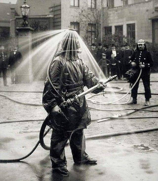 上世纪初的消防员套装,通过淋浴式设计来对抗火场的炙热高温。