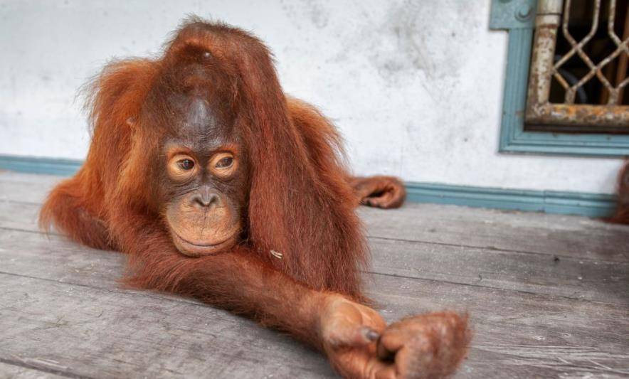 婆罗洲红毛猩猩,它从母亲那里学会了如何在森林中寻找可食用的植物。