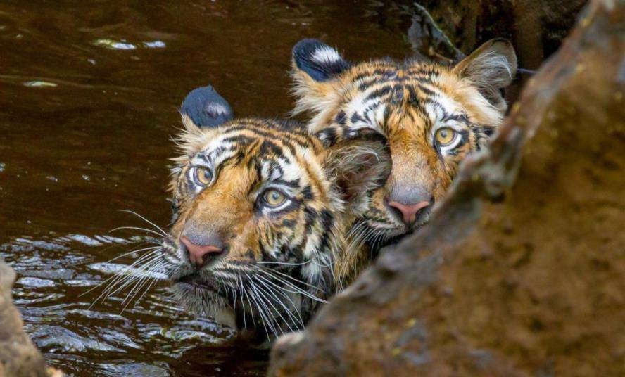 两只虎崽在印度班达哈国家公园玩水,全球现存4000只孟加拉虎有7成生活在印度。