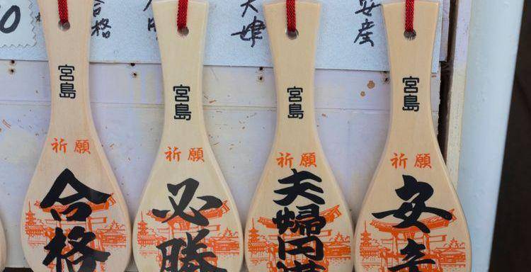 在商店街则可以买到著名的纪念品:饭杓。各位可能在严岛神社或邻近寺社所悬挂的绘马架上,已经看过被当成绘马写上祈愿字句的饭杓。说到饭杓为什么会变成严岛代表性的纪念品,要从严岛的信仰说起。